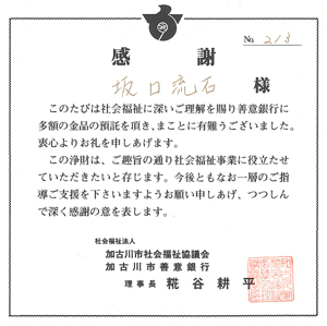 平成21年1月23日 社会福祉法人 加古川市社会福祉協議会 加古川市善意銀行 理事長 糀谷耕平様より感謝状をいただきました。